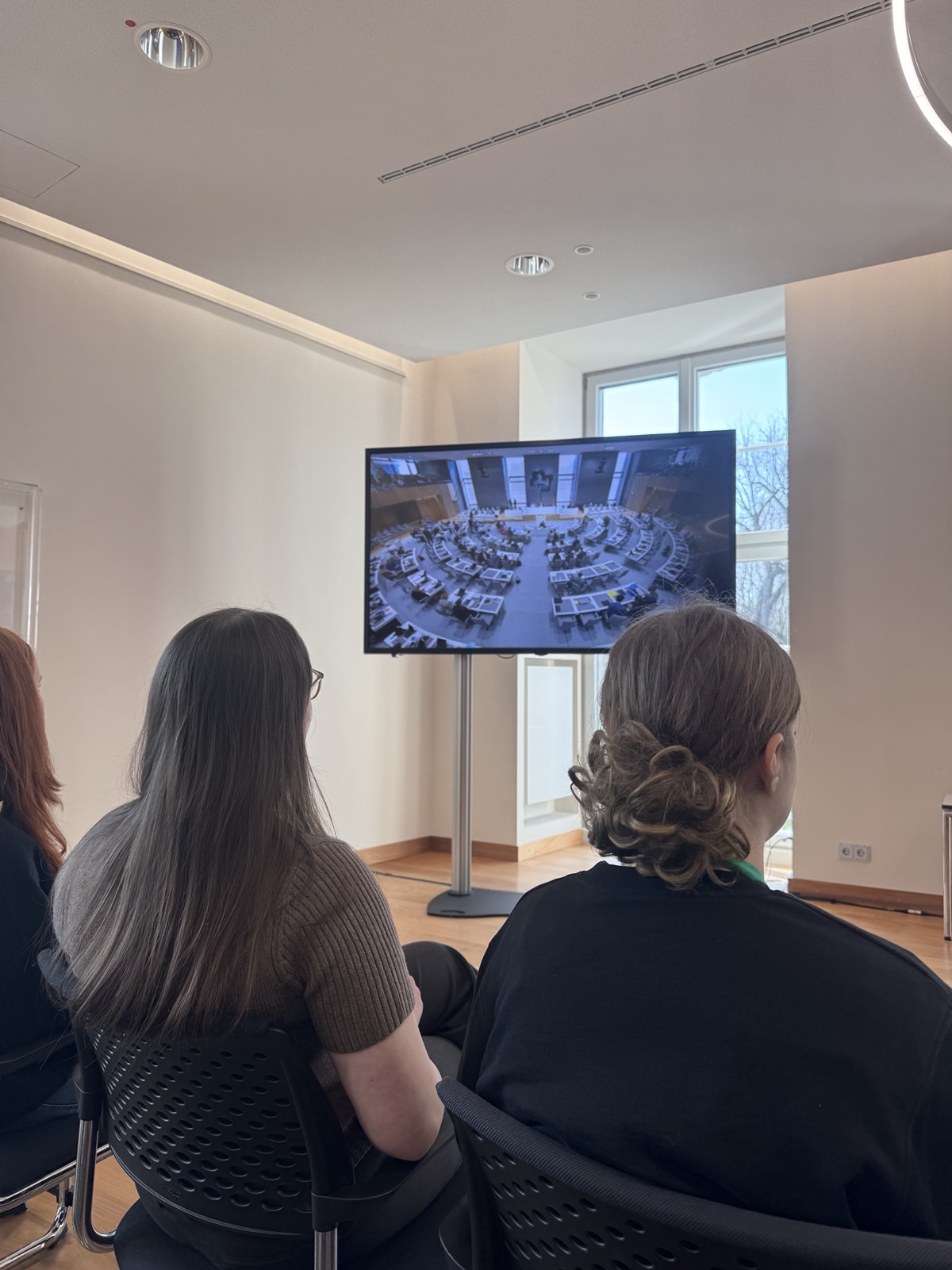 Im Landtag angekommen, erhielten die Jugendlichen eine kurze Einführung in den Aufbau und die Arbeit des Landtages. Die Besuchsprogramme versuchen, Vorbehalten entgegenzutreten, demokratische Prozesse verständlich und das Parlamentsgeschehen erlebbar zu machen. Und natürlich Mitwirkungsmöglichkeiten aufzuzeigen. So konnten die Schüler*innen die parlamentarische Arbeit von der Besuchertribüne aus beobachten.