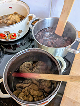 2. Danach haben wir Wolle und Seidentücher mit roten und gelben Zwiebelschalen gefärbt.