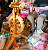 3. Wir haben die Wolle mit Handspindeln und dem Spinnrad gesponnen.